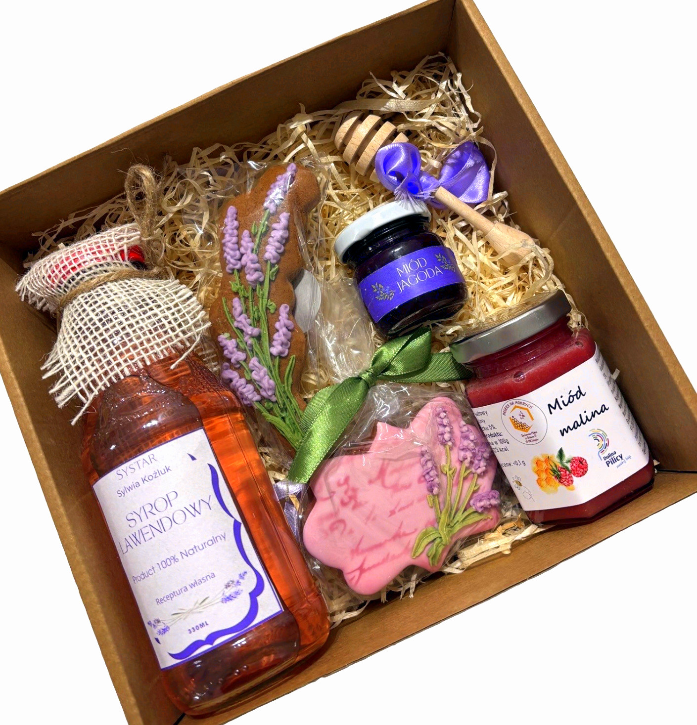 • Skomponowany z naturalnych ręcznie robionych produktów. Każdy element zestawu to naturalny produkt wysokiej jakości – przyciąga swoimi walorami i pozytywnie wpływa na samopoczucie. Ręcznie robiony syrop lawendowy, piernik w kształcie lawendy i miody o różnych smakach stanowią doskonałą kompozycję dla osób ceniących lekkość i emocjonalne uniesienia.